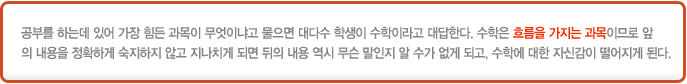 ¼öÇÐÀº °¢ ´Ü¿øÀÇ ±âº» °³³äÀ» ÀÌÇØÇÏ´Â °ÍÀÌ ¹«¾ùº¸´Ù Áß¿äÇÑ °ú¸ñÀÌ´Ù. ÃʹÝÀÇ ±âº» °³³äÀ» Àß ÀÌÇØÇÏÁö ¸øÇÏ¸é µÞ ºÎºÐÀ¸·Î °¥ ¼ö·Ï ´õ ¾î·Á¿ö Áø´Ù. ±³Àç´Â ±³°ú¼¸¦ ±âº»À¸·Î ÇÏ¿© ±âº» °³³ä ¼³¸íÀÌ Ç³ºÎÇÑ ±âº»¼ ÇÑ ±ÇÀ̸é ÃæºÐÇÏ´Ù.